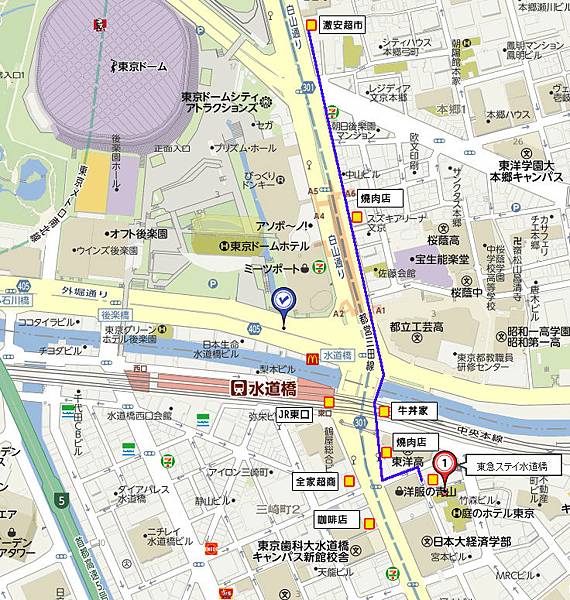 水道橋JR車站分東口跟西口, 我們住的飯店在東口 5分鐘的距離, 因此走動活動的路線幾乎都是在東口這邊, 帶著小孩真的不能期待走太遠,